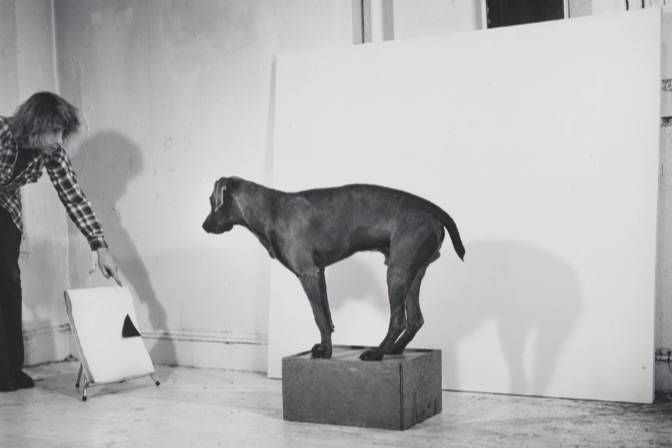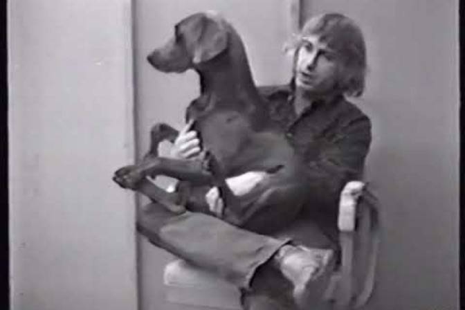 William Wegman: Video and Performance (b. 1943, Massachusetts, USA) showcases Wegman’s early video and performance works, which exemplify a unique blend of deadpan humor, conceptual rigor, and performative simplicity. Working in the early 1970s with a fixed camera and minimal props, Wegman created short, single-take video pieces that often featured his Weimaraner dog, Man Ray, as both co-star and conceptual foil.